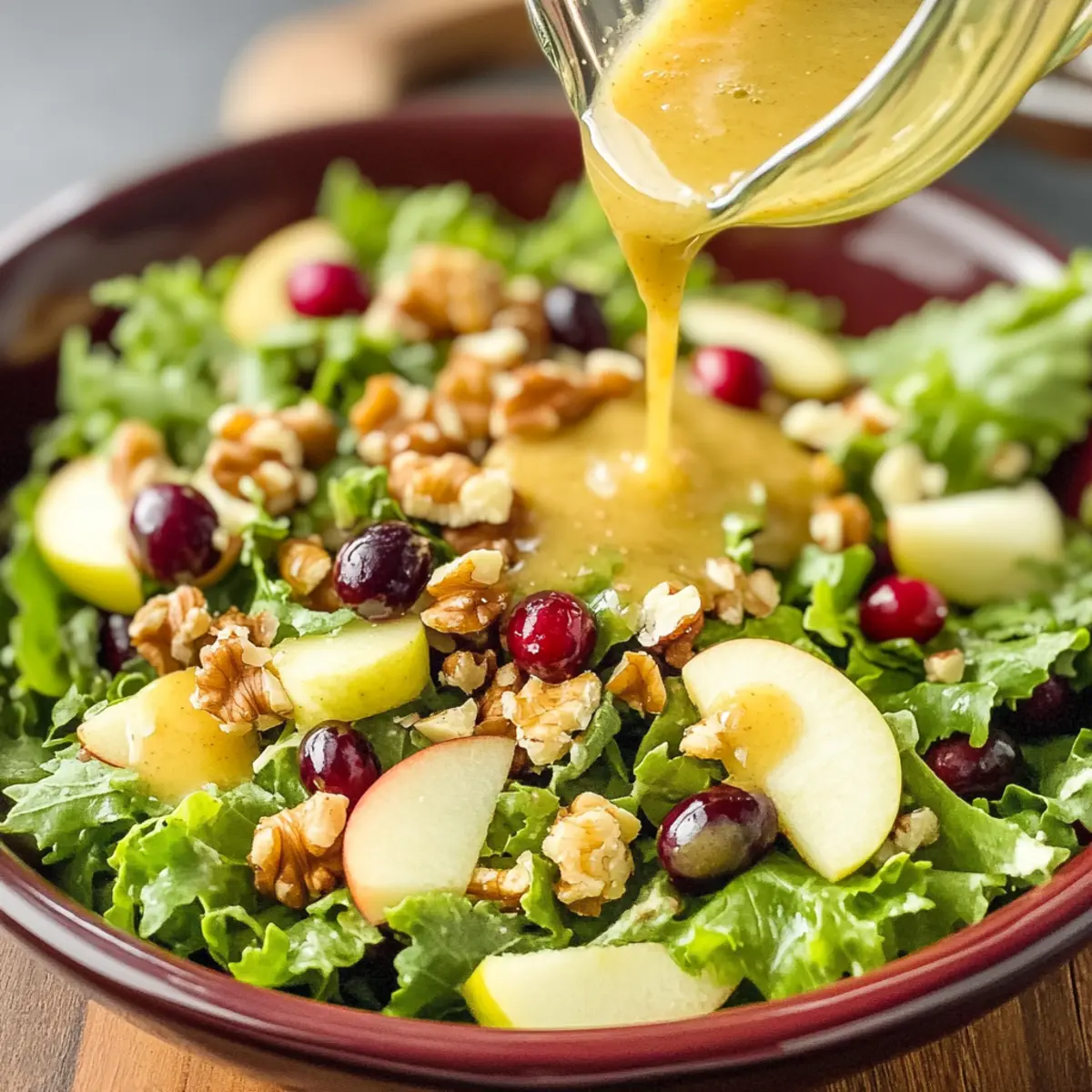 In a separate bowl, whisk together ¼ cup of olive oil, 2 tablespoons of apple cider vinegar, a tablespoon of honey, and 1 teaspoon of Dijon mustard until the dressing is well-emulsified and smooth. The vinaigrette adds a tangy contrast to the sweetness of the apples and cranberries, enhancing the overall flavor of your Apple Cranberry Walnut Salad.