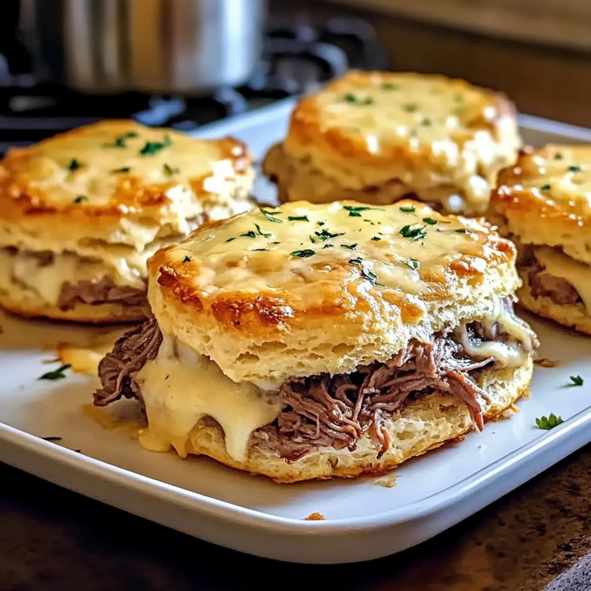 These Baked French Dip Biscuits are perfect for meal prep enthusiasts! You can prepare the biscuit dough and fill the biscuits with roast beef and cheese up to 24 hours in advance. Simply assemble them fully, then wrap and refrigerate in an airtight container to maintain their freshness. The au jus can also be made ahead and stored in the fridge for up to 3 days, just warm it up before serving. When you’re ready to bake, place the biscuits directly in the oven without needing to thaw them first, adding an extra 5 minutes to the baking time for impeccable results. With these make-ahead tips, you’ll enjoy delicious, homemade comfort food with minimal fuss on busy weeknights!