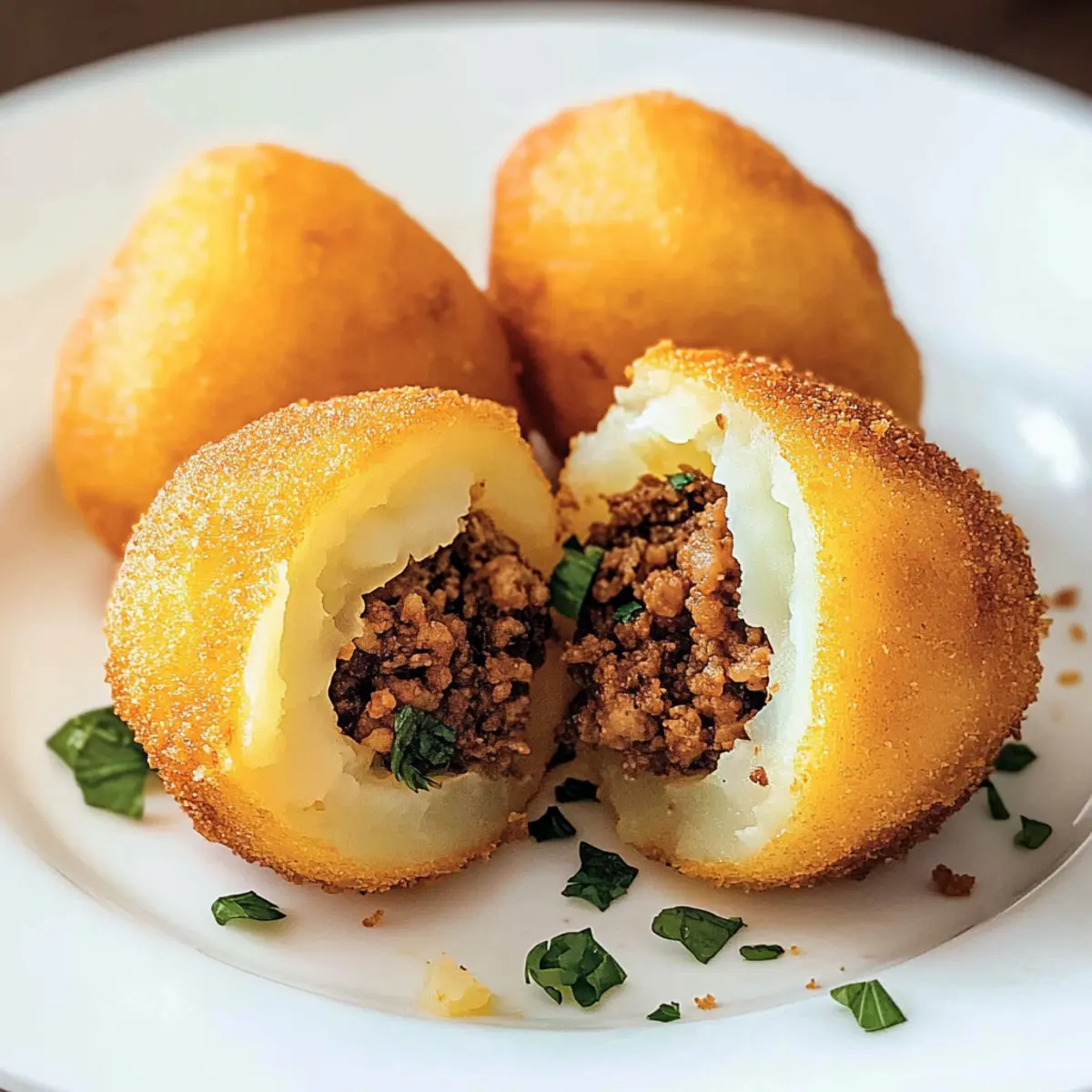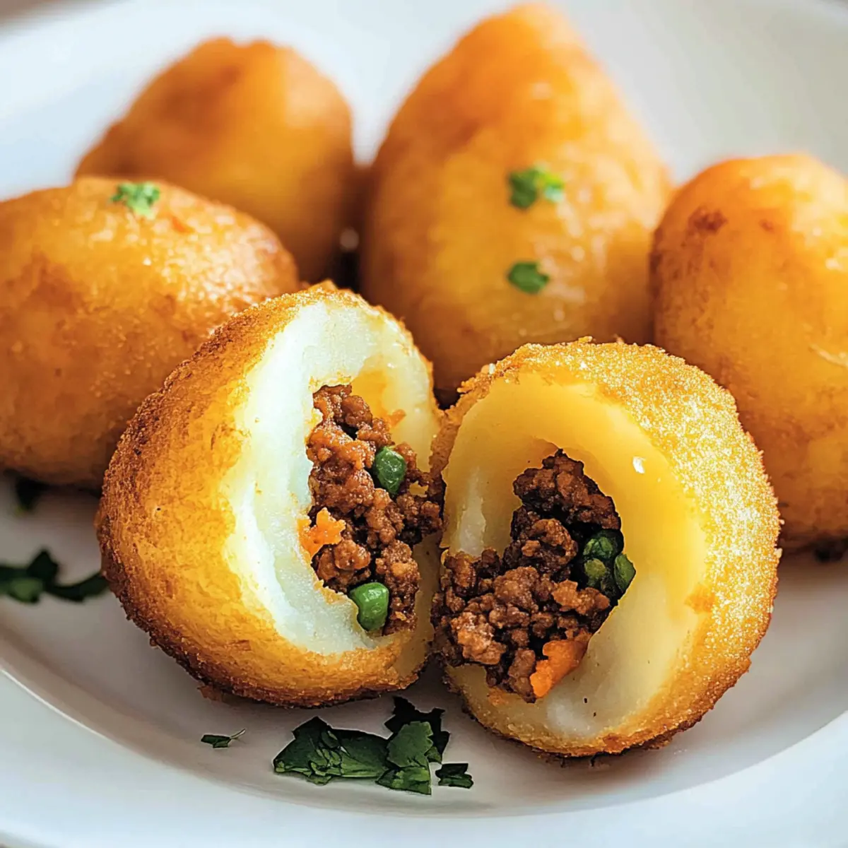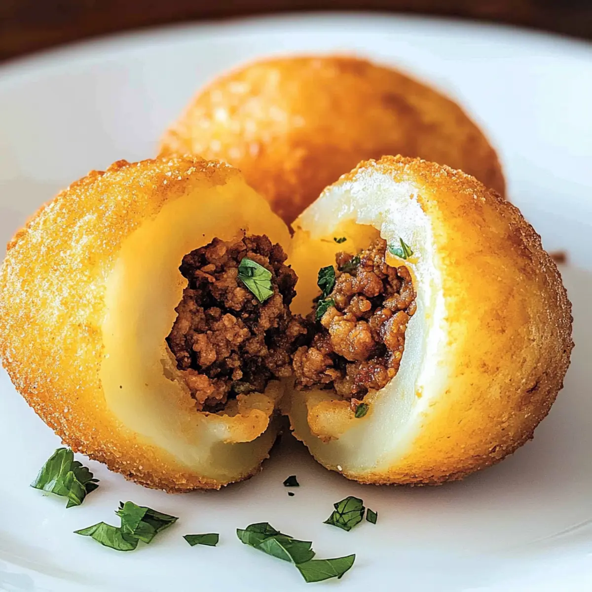- Cool the potato mixture, scoop portions, flatten, add beef filling, and seal to form balls.