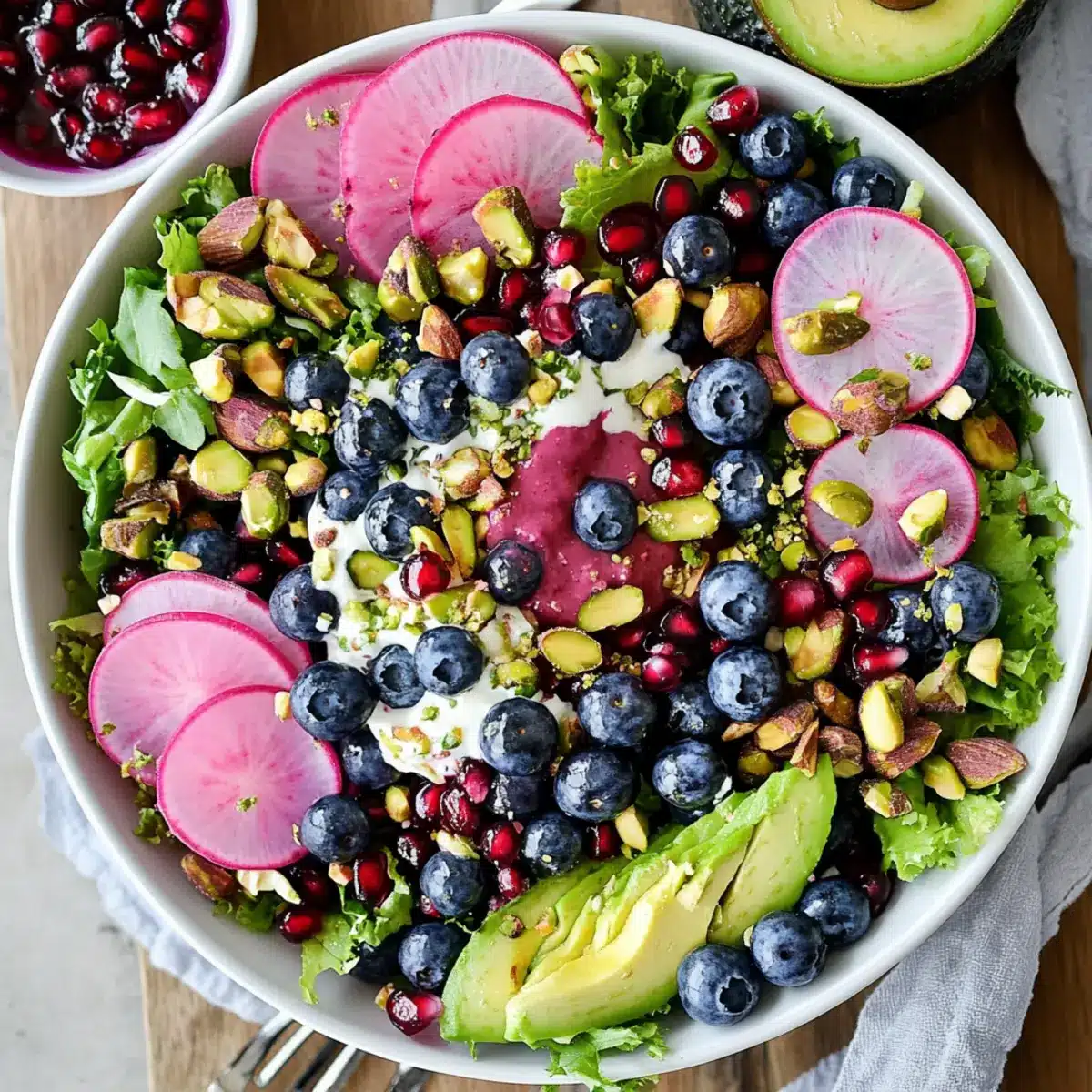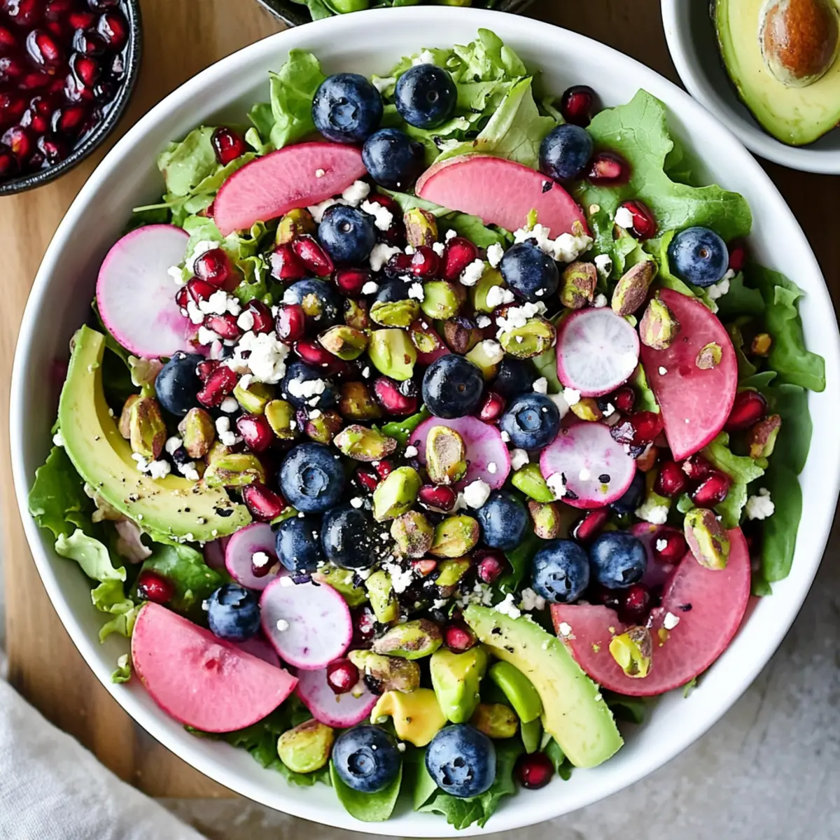 - Assemble the salad by layering in watermelon radish, avocado, red onion, blueberries, pomegranate arils, cooled candied pistachios, and feta cheese.