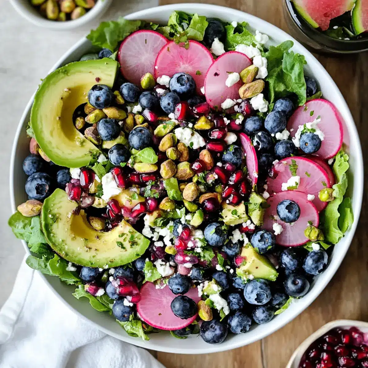 Layer the salad with thinly sliced watermelon radish, sliced avocado, thin red onion slices, fresh blueberries, and pomegranate arils. Carefully add the cooled candied pistachios and 2 ounces of crumbled feta cheese on top. This glorious arrangement not only looks appealing but also provides a delightful blend of flavors and textures.