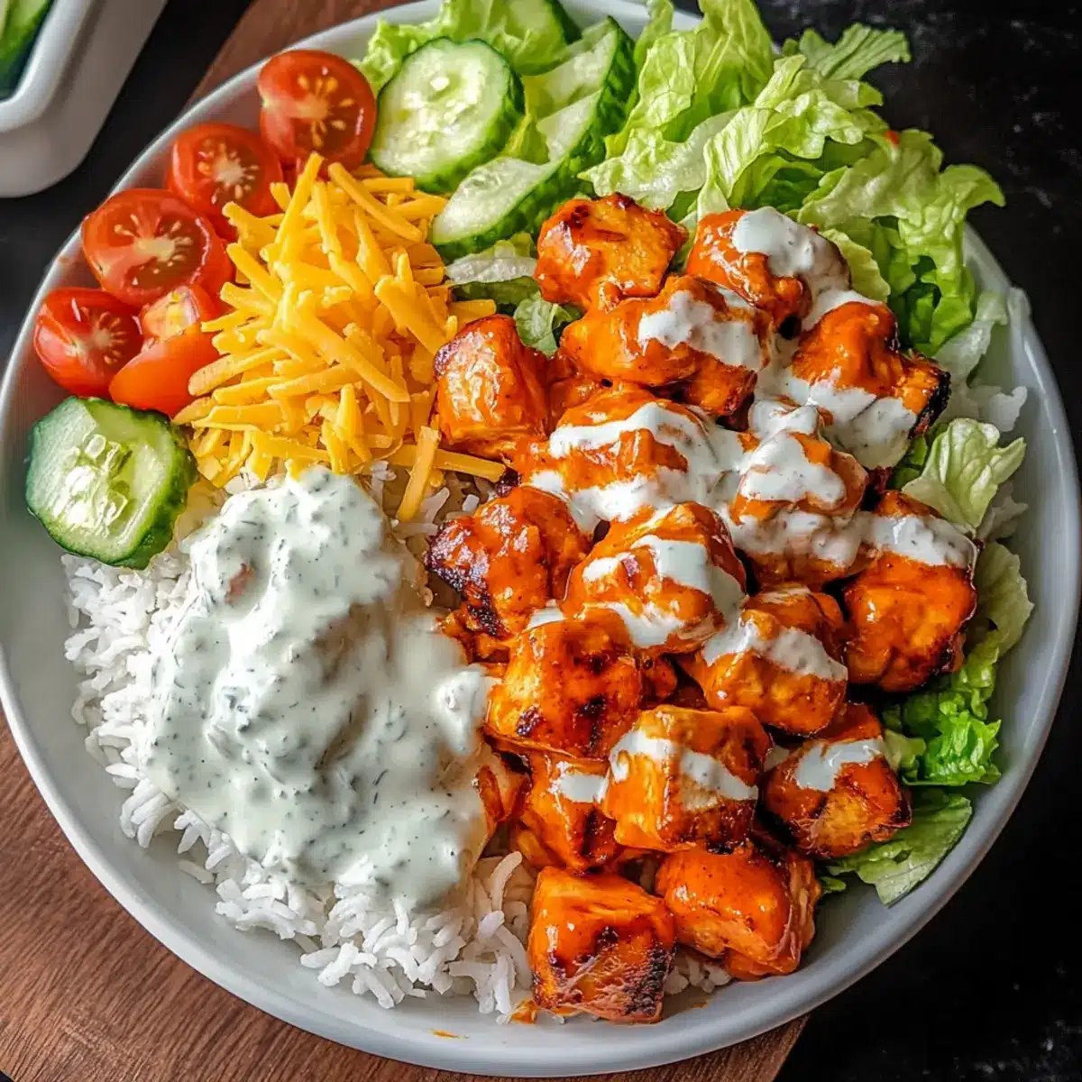 Top each bowl with a vibrant layer of shredded lettuce and halved cherry tomatoes, adding crunch and freshness. These colorful toppings not only enhance the visual appeal of your Buffalo Chicken Bowls but also provide a cool contrast to the spiciness of the chicken.