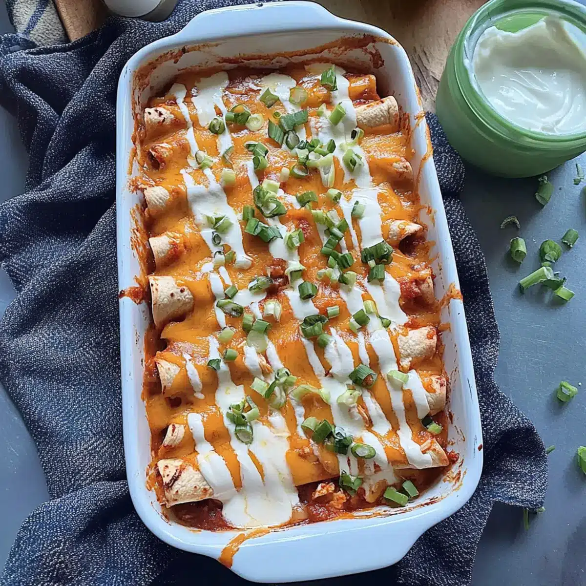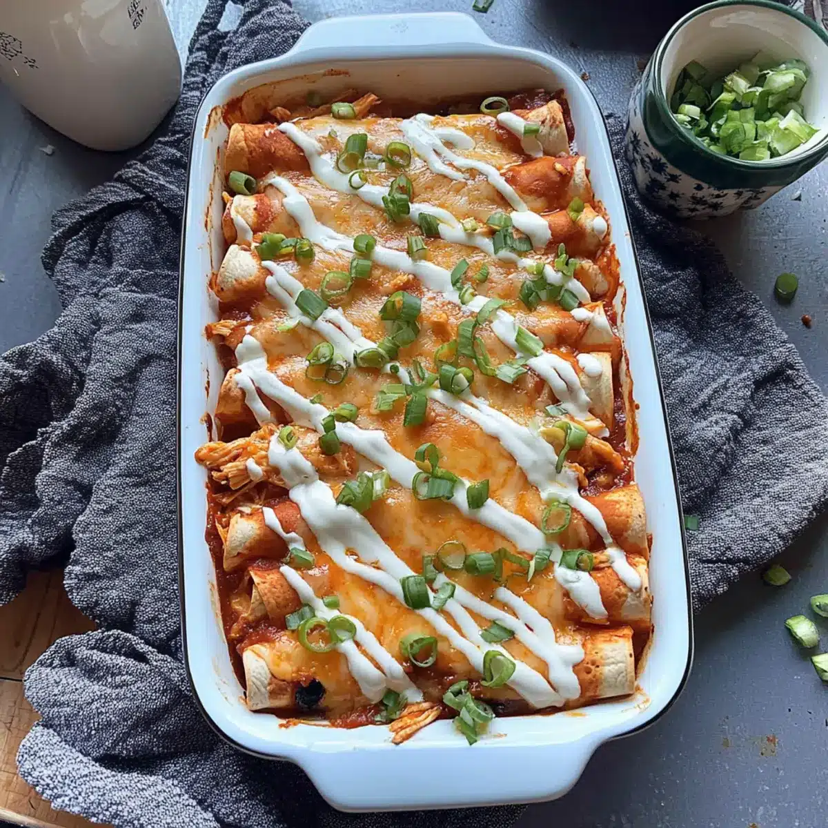 Once baked, take the enchiladas out of the oven and let them cool for a few minutes. Drizzle with ranch dressing and garnish with chopped green onions before serving. These finishing touches elevate your Buffalo Chicken Enchiladas and prepare them for a delightful dining experience!
