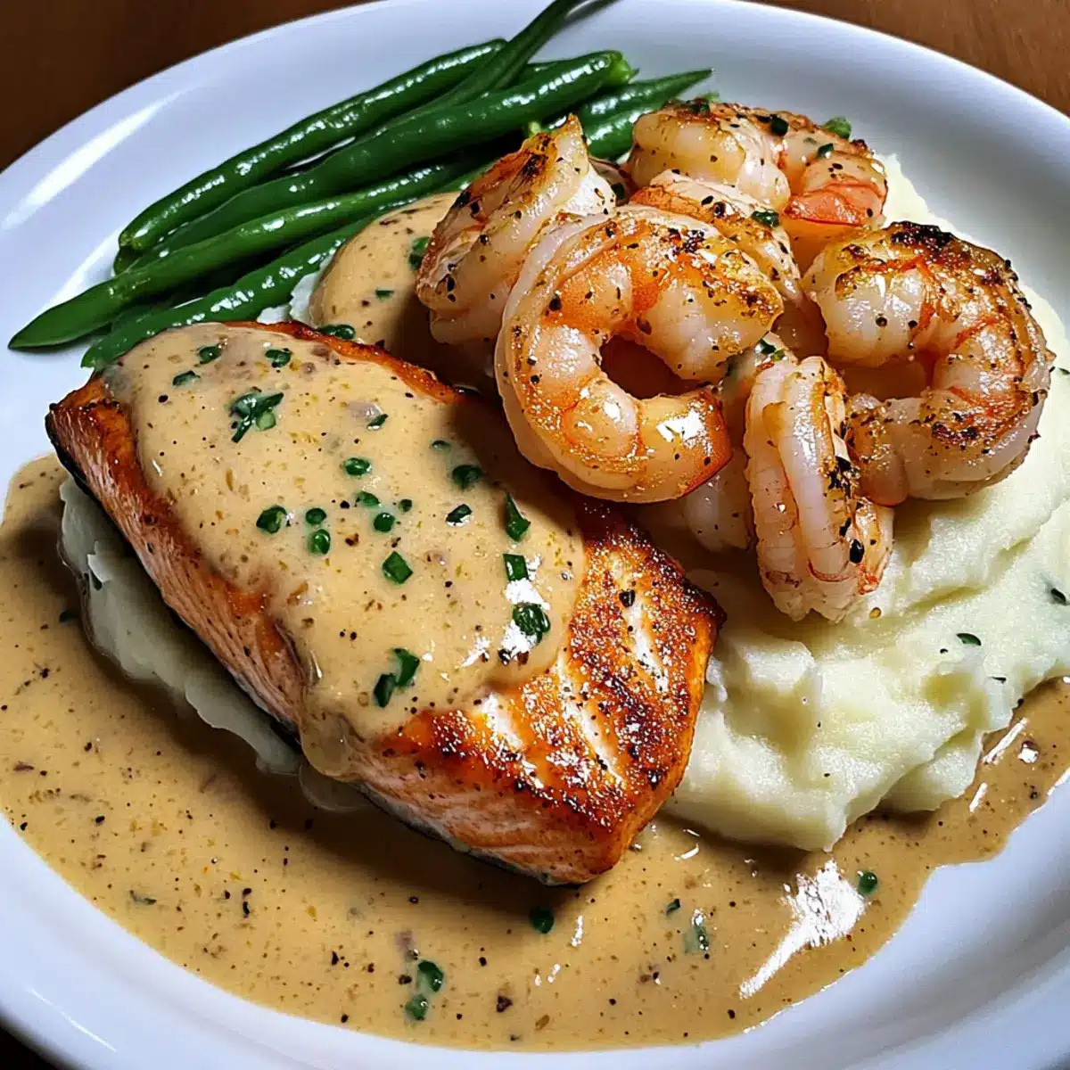 To serve your Cajun Shrimp and Salmon, spoon a generous portion of mashed potatoes onto each plate. Arrange the golden salmon and succulent shrimp artistically atop the potatoes. Drizzle the luscious garlic cream sauce over the seafood and garnish with the fresh green beans on the side for a beautiful and inviting presentation.
