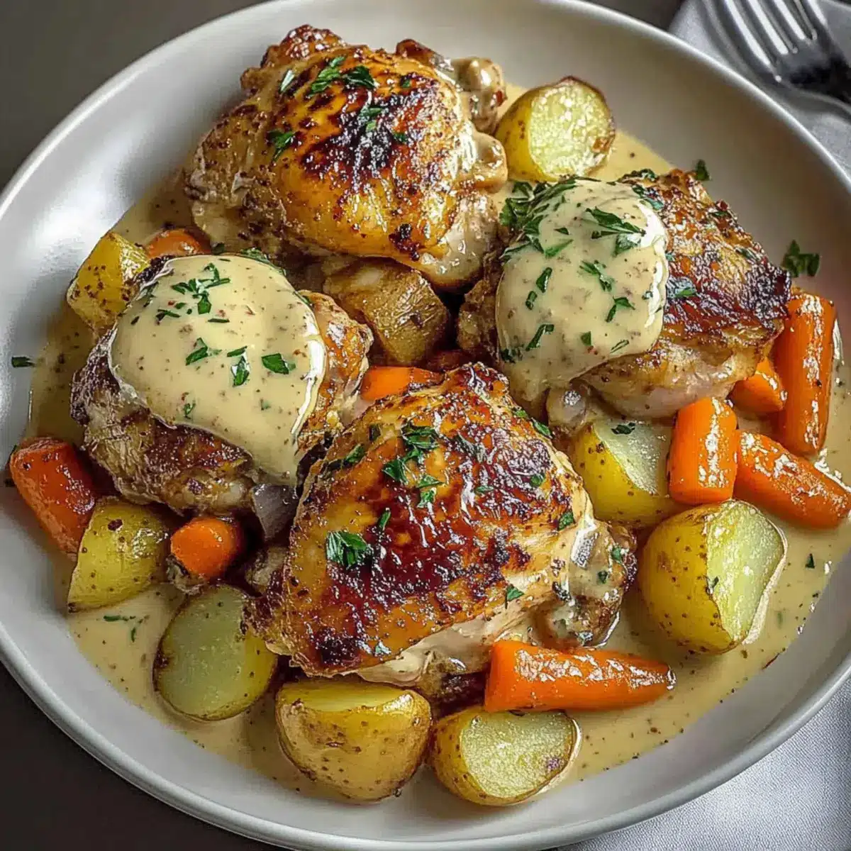 Creamy Baked Dijon Chicken Thighs with Sweet Root Veggies