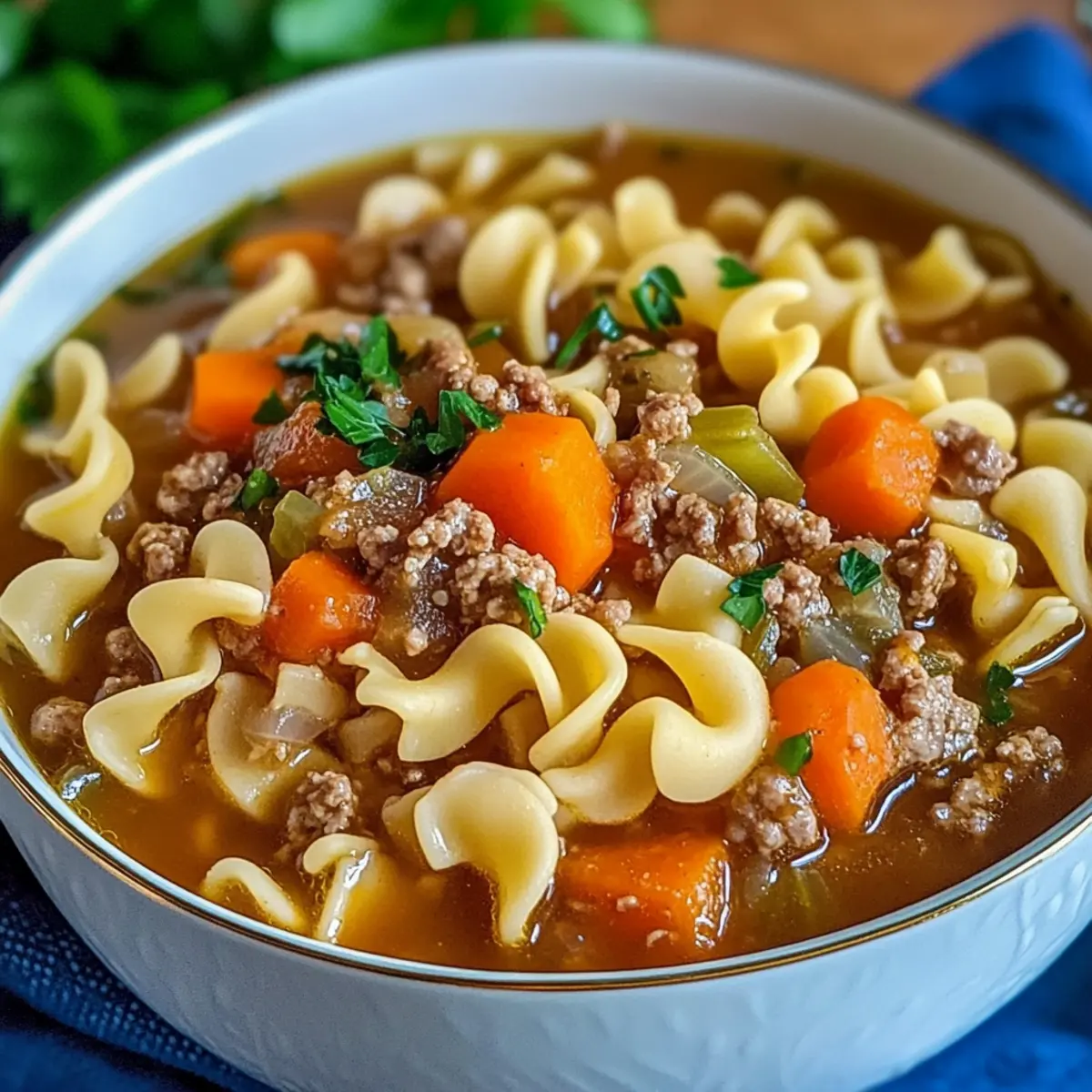 With these variations, your Easy Hamburger Noodle Soup will never be boring, meaning you’ve got plenty of options to suit your taste buds! Looking for more comforting recipes? Check out my Hearty Beef Stew for another cozy dish or consider trying a vibrant Vegetable Soup when you’re in the mood for something lighter. Enjoy the creation of each bowl!