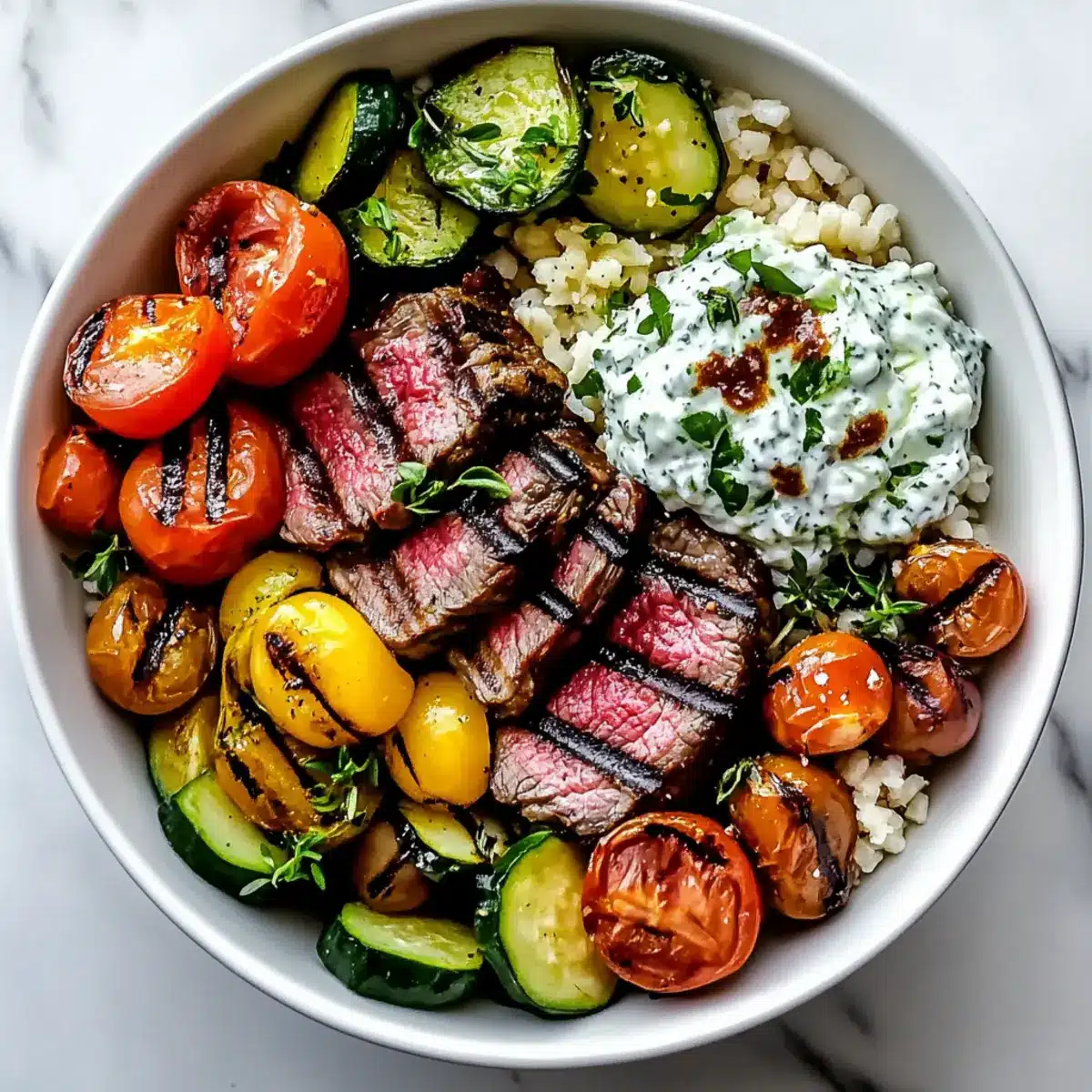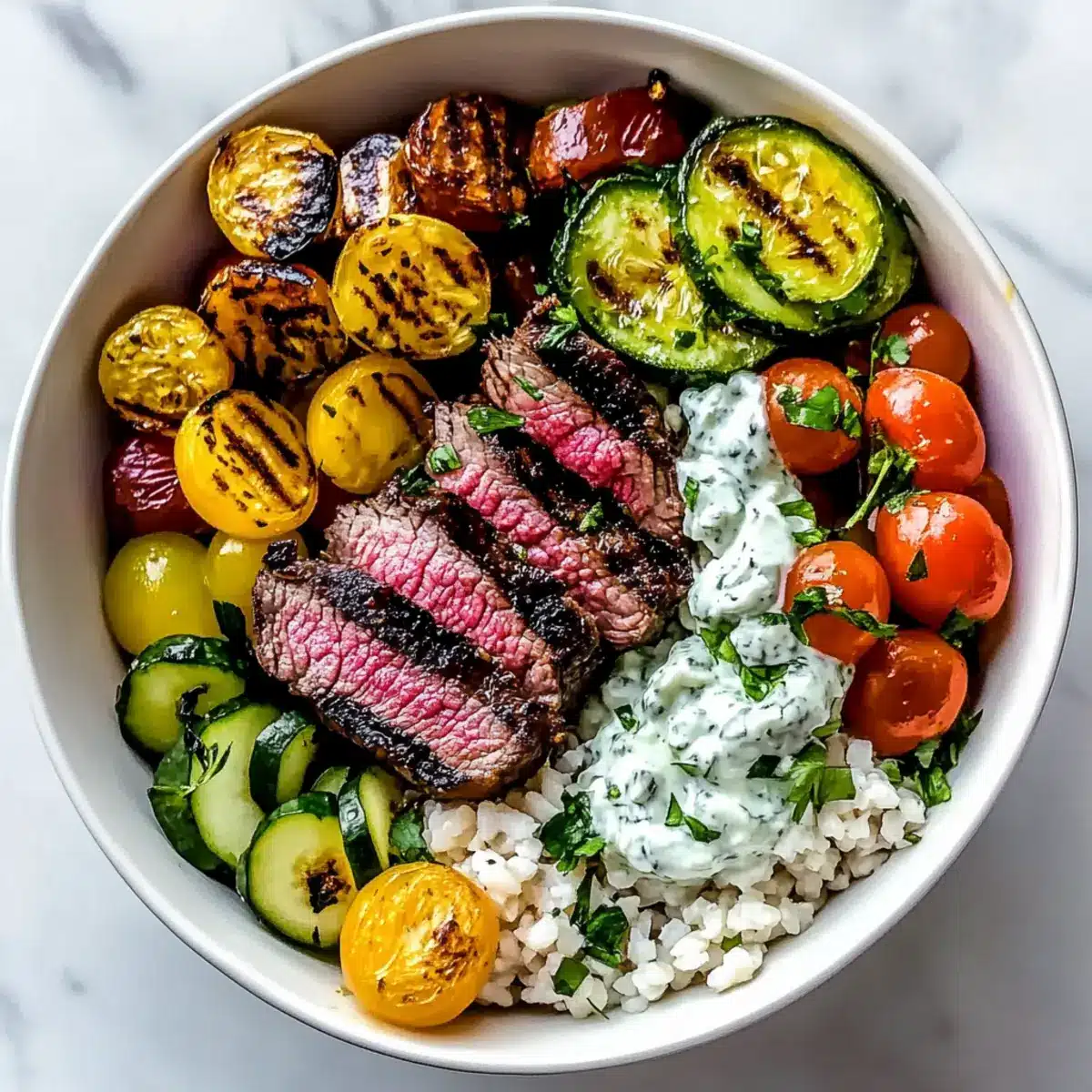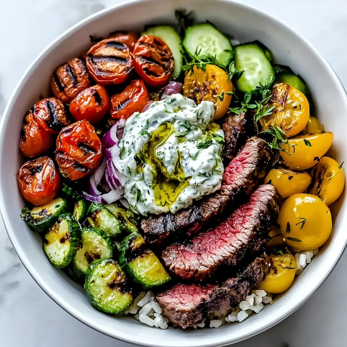 - Assemble the bowl with a base of cooked grains, topped with sliced steak, cherry tomatoes, cucumber, red onion, olives, and optional toppings. Drizzle with tzatziki and vinaigrette.