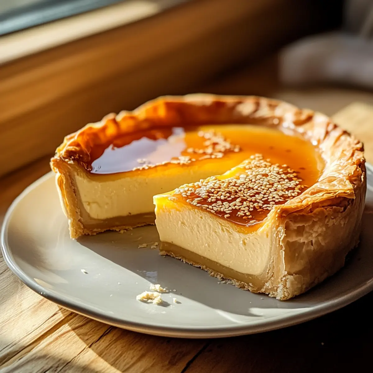 Once out of the oven, allow the pie to cool for about 10 minutes. Then, drizzle warm honey over the surface, letting it soak into the layers for added sweetness. Finish by sprinkling toasted sesame seeds on top for a nutty flavor and an irresistible crunch, enhancing the overall taste of your Golden Greek Honey Pie.