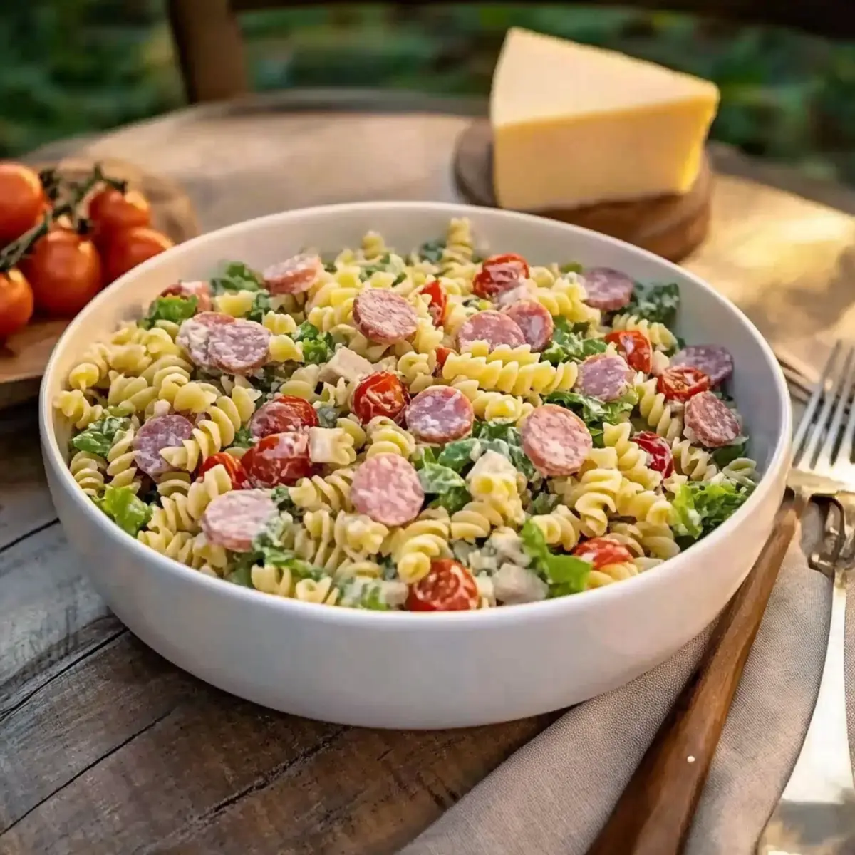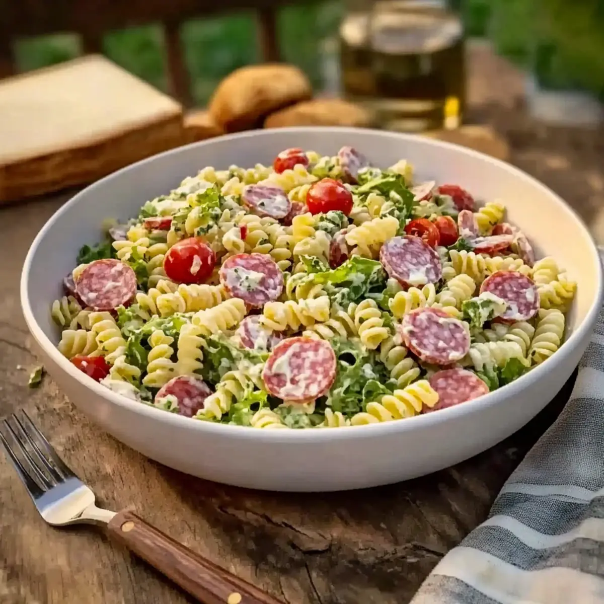 - Rotini Pasta – Holds the dressing well and provides a satisfying bite.
