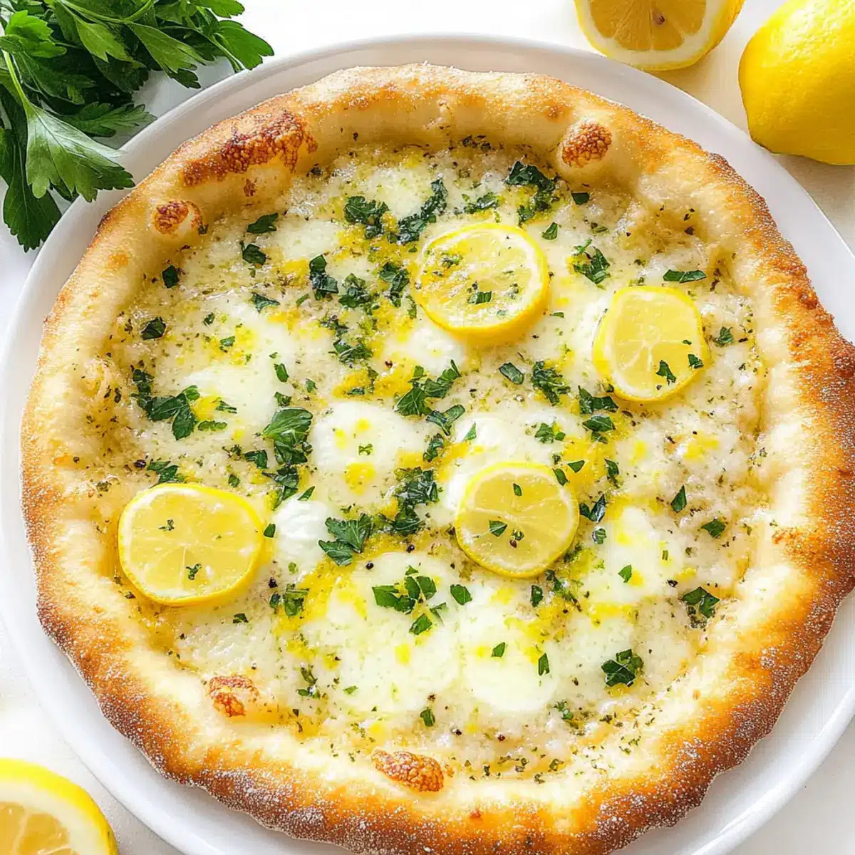 Once baked, remove the Lemon Pizza from the oven and drizzle additional lemon juice over the top for an extra zesty kick. Sprinkle with grated parmesan cheese, more fresh parsley, and a hint of black pepper for flavor. Slice into pieces and serve immediately, enjoying this delightful and refreshing treat!