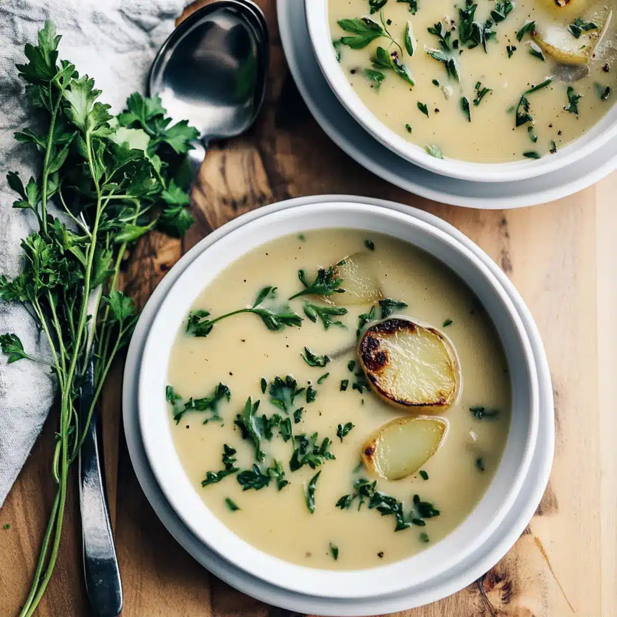 Comforting Warmth: There’s just something magical about curling up with a bowl of warm garlic soup, especially when the leaves start to fall. Nutritious Boost: With its immune-boosting properties, this soup is perfect for warding off colds during the chilly season. Simplicity: The recipe requires just a handful of ingredients, making it straightforward and stress-free for home cooks. Versatile Enjoyment: Customize it with your favorite herbs or toppings to suit everyone’s taste – add croutons or even a poached egg for an elevated touch! Crowd-Pleasing Flavor: The rich, velvety texture and robust flavor are sure to impress guests, making it a fantastic option for cozy gatherings. Dive into comfort with this Roasted Garlic Soup and enjoy every spoonful of warmth!