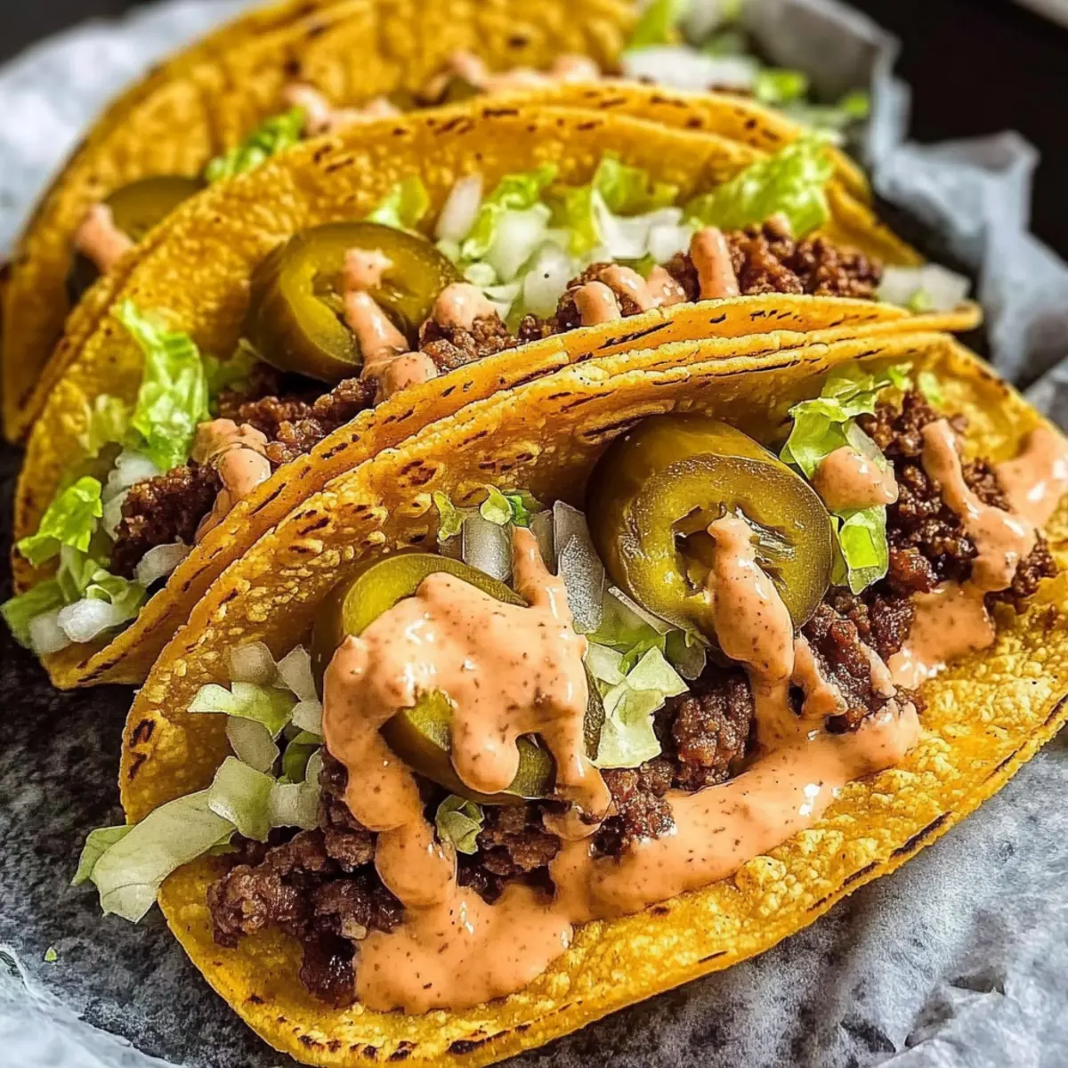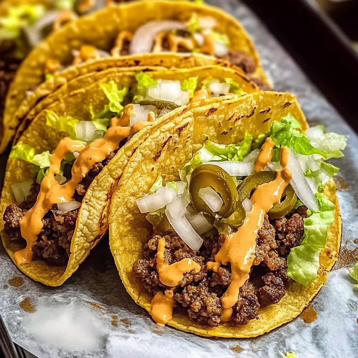 - Remove the tacos from the skillet and drizzle with burger sauce. Top with lettuce, onions, and pickles.