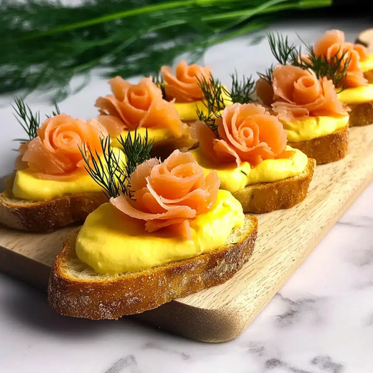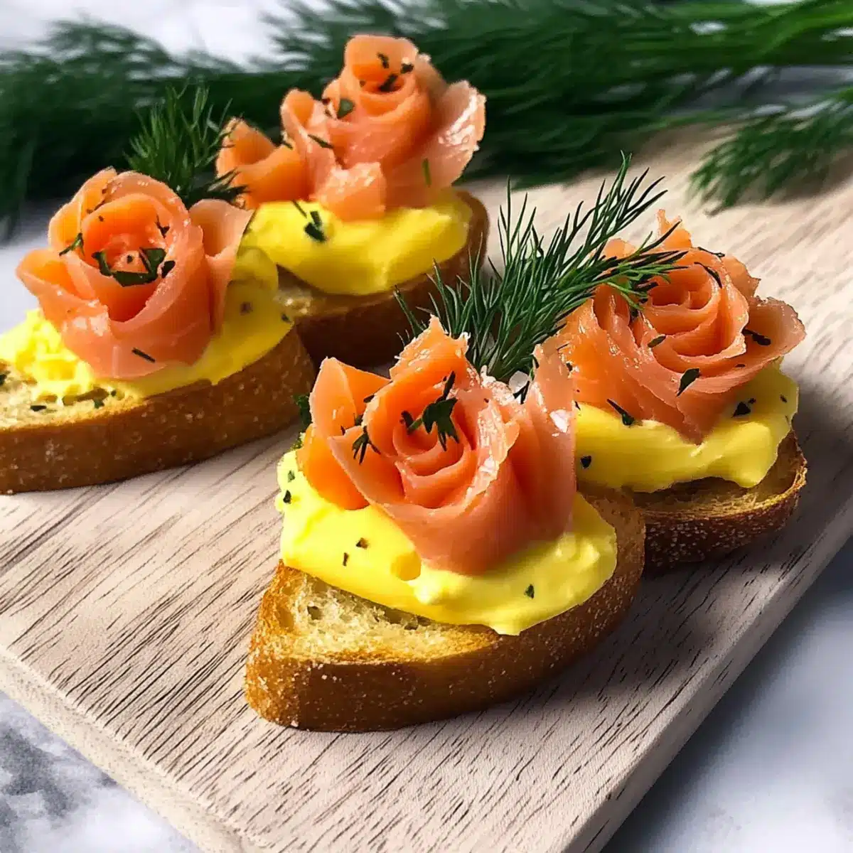 - Apply a thin layer of Egg-Cheddar Mousse onto each crostini. Use piping bag to create decorative swirls. Roll smoked salmon into roses and place on top. Sprinkle with fresh dill and black sesame seeds if desired.