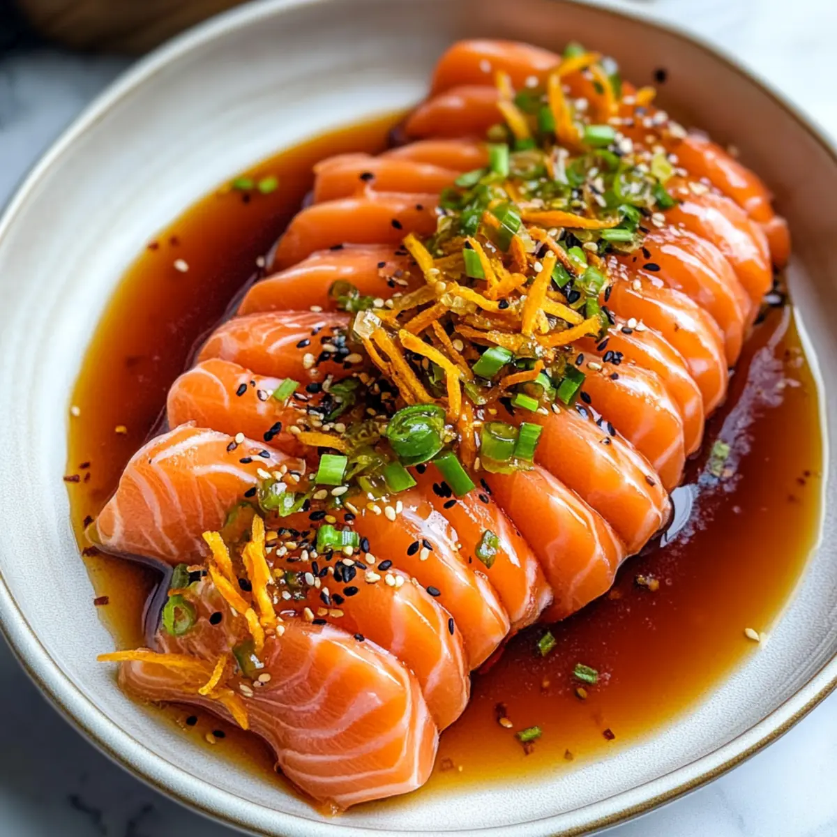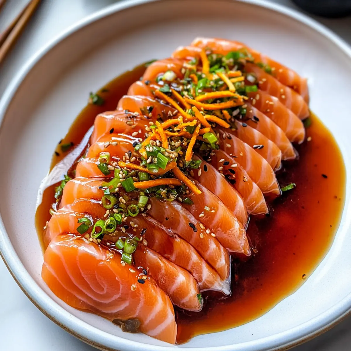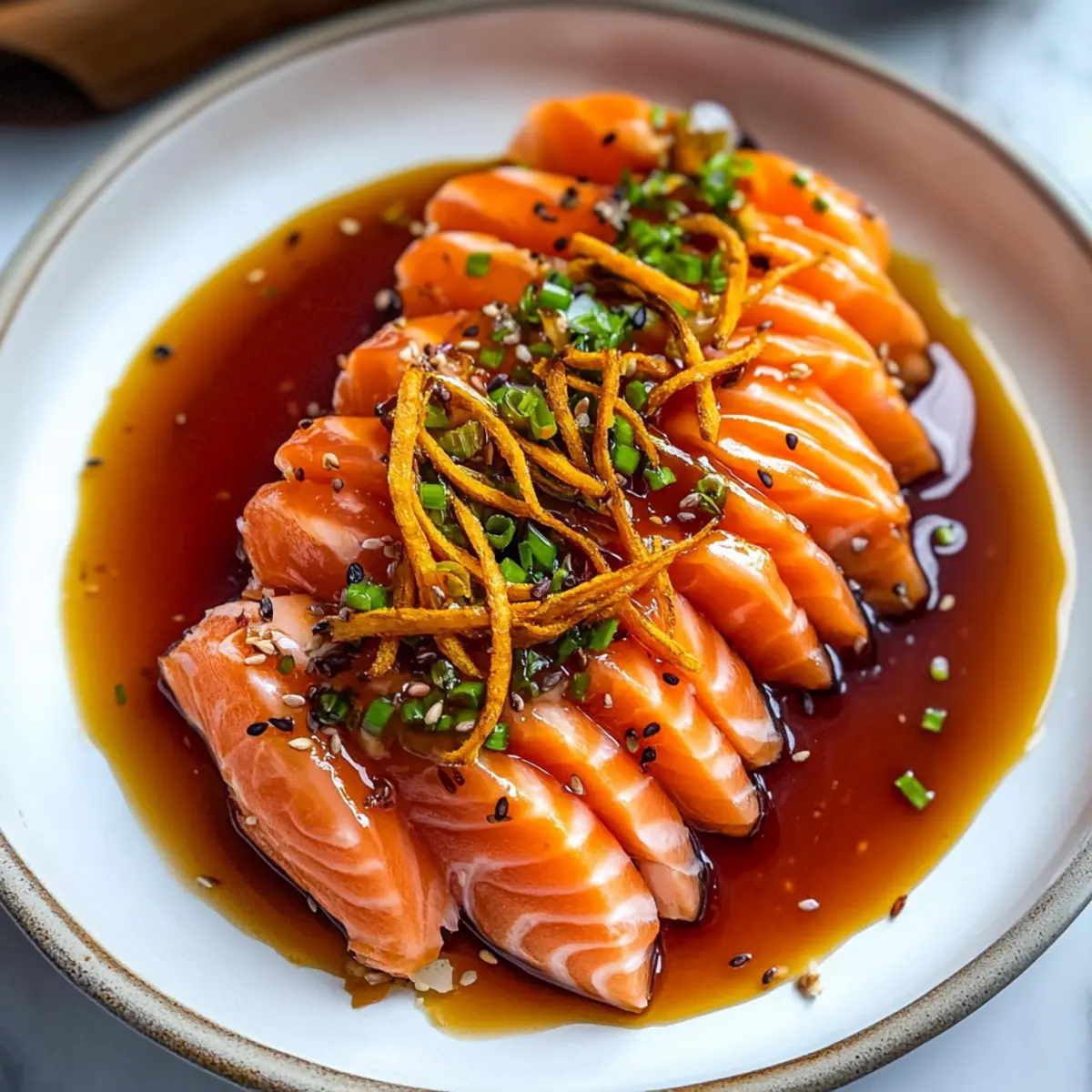 - To plate, strain the sauce into a shallow dish. Arrange the sushi-grade salmon slices on top of the sauce, drizzle with remaining sauce, sprinkle crispy carrots, and finish with lemon zest and chilled scallions.