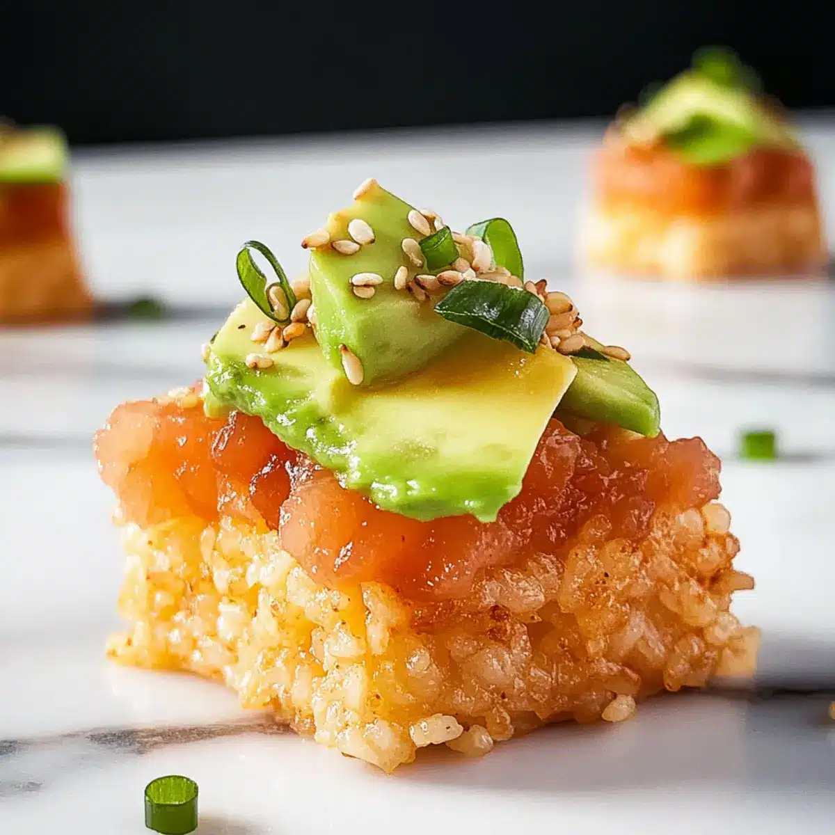 Now it’s time to assemble your Spicy Tuna Crispy Rice. Place a slice of avocado on top of each golden rice rectangle, then spoon the spicy tuna mixture generously over the avocado. Finish off with a sprinkle of toasted sesame seeds and garnish with chives or thin slices of jalapeño for a pop of color and flavor. Enjoy your homemade delight!