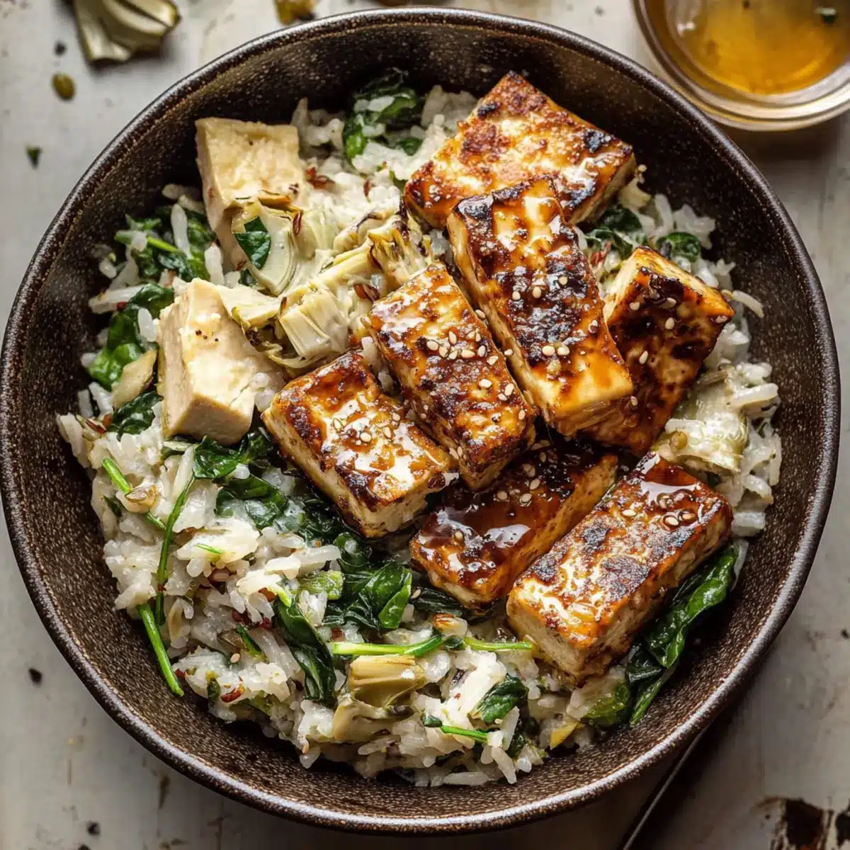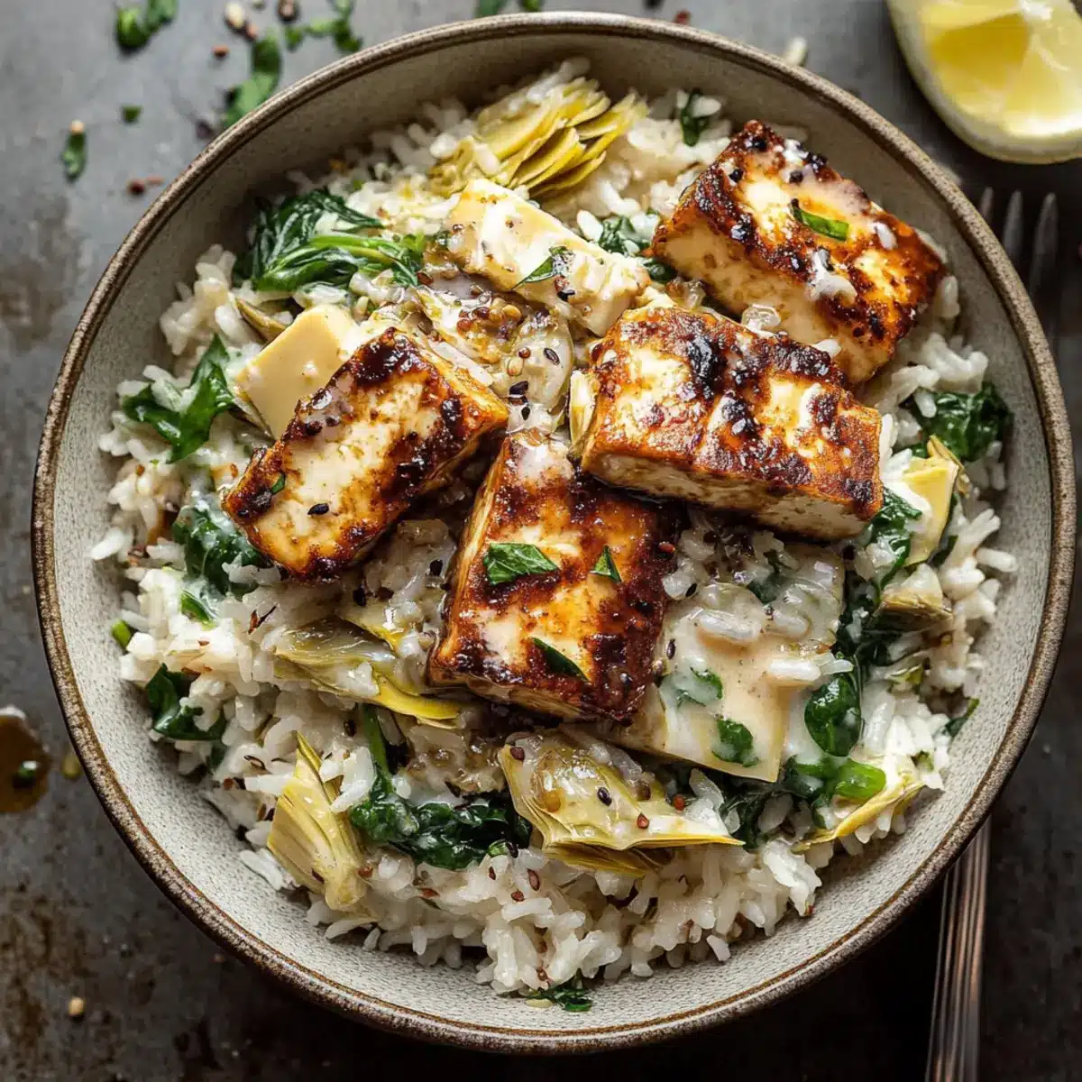 The aroma of sizzling tofu mingling with fresh herbs filled my kitchen, instantly transporting me to a cozy café where each forkful of Spinach Artichoke Rice seems to warm the soul. This dish is more than just a meal; it’s a vegan treasure that embodies comfort and satisfaction without the fuss. Imagine a one-pot wonder where creamy basmati rice meets tender artichokes and vibrant spinach, all topped with golden, crispy tofu drizzled in a hot honey marinade. Not only does this Spinach Artichoke Rice offer a nourishing escape from fast food, but it also promises quick prep for those busy weeknights when your heart yearns for something homemade yet effortless. What’s even better? Leftovers heat beautifully, allowing you to relish this delightful dish again and again. Ready to dive into a bowl of hearty comfort? Let’s get cooking!