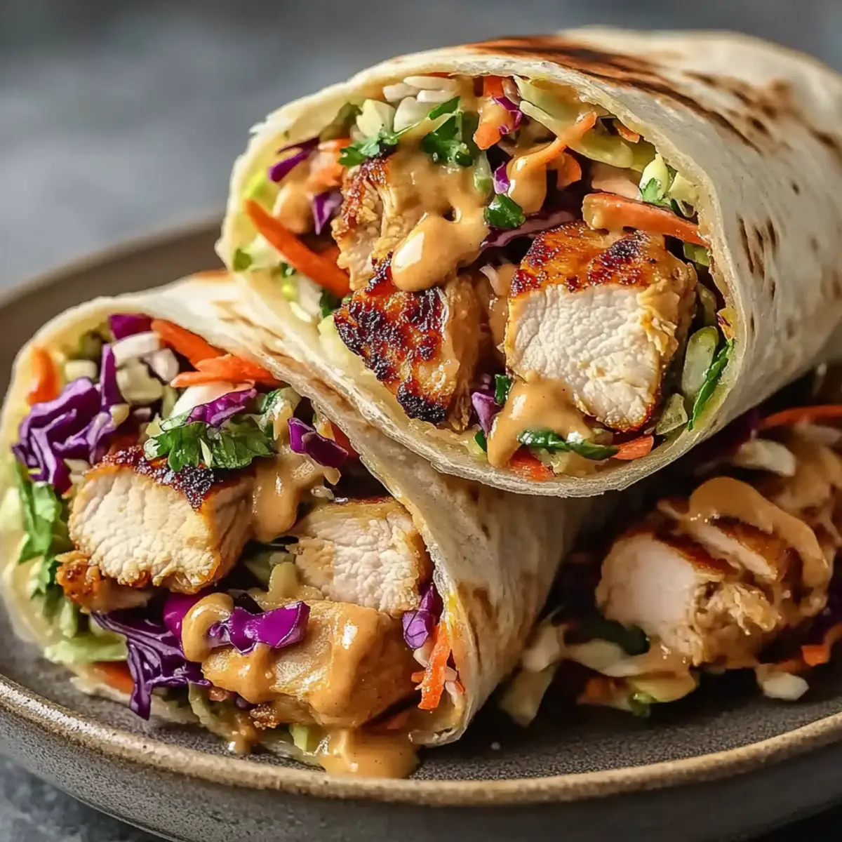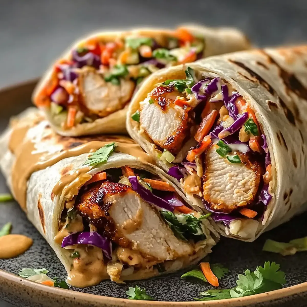 - Warm tortillas or flatbreads briefly, spread peanut sauce, layer crunchy Asian slaw and sliced chicken, drizzle more peanut sauce, and roll tightly. Slice in half to serve.