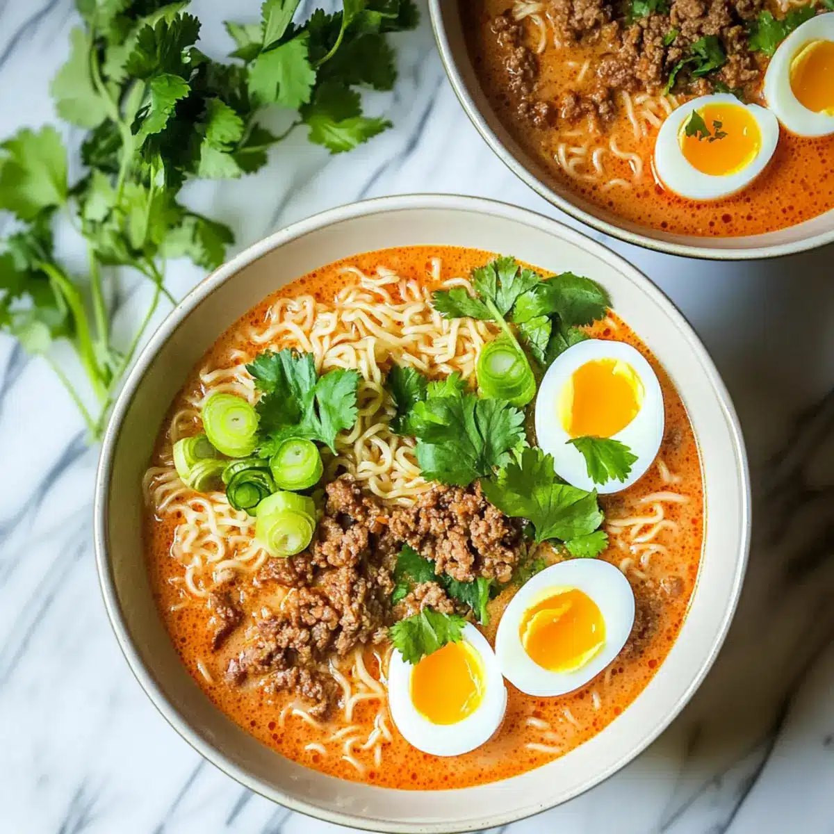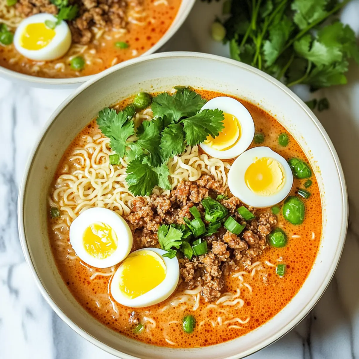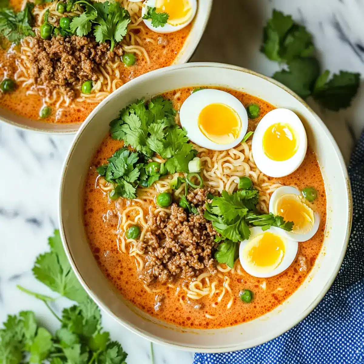 To serve, divide the cooked noodles among bowls and ladle the aromatic coconut curry broth over them. Top each bowl with the saucy ground pork mixture, and elevate your ramen with soft boiled eggs, fresh cilantro, green onions, and a sprinkle of toasted sesame seeds. This vibrant bowl of Thai Coconut Curry Ramen is ready to bring joy to your table!