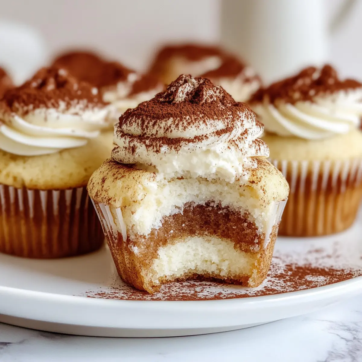 Present your beautifully decorated Tiramisu Cupcakes on a lovely serving platter, perfect for gatherings or a sweet personal treat. Allow them to sit for a moment to showcase their enticing designs, then dive into a world of flavors that blend espresso and cream, capturing the essence of tiramisu in every bite!